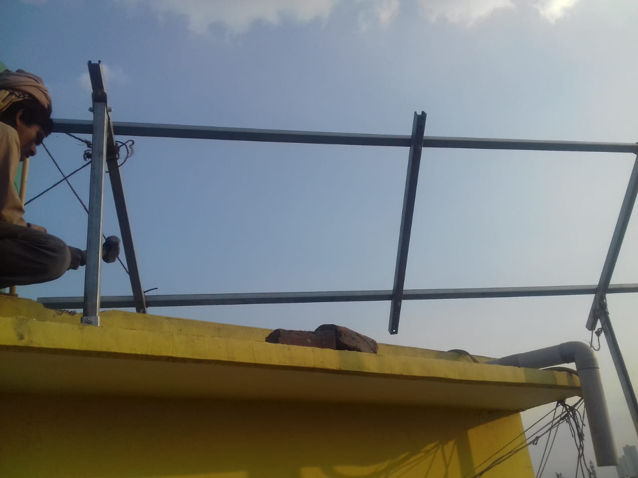 Now, the challenges in installing a Solar power plant in Delhi is- Less rooftop space and bigger Solar panel size along with direction maintenance. We recently installed a 2KW Grid Tied Solar power plant at New Kondli, Mayur Vihar, Ph-V, New Delhi along with Shleyroyal Imagineering and the installation was a challenge, as no Structure fabricator was willing to visit such a small site for raised structure design. We designed the structure with proper direction and a 28 degree angle towards South at a minimum height of 7 feet and maximum height of 10 feet and 6 inches, as the total area available for installation was 33 sq. yards only. We got the structure fabricated and started the most difficult job i.e. Mounting of the super structure. As the rooftop is at 4th floor. We started with making marking on the floor for Structure base plates and then cutting the tiles with Tile cutter in the below shown way-